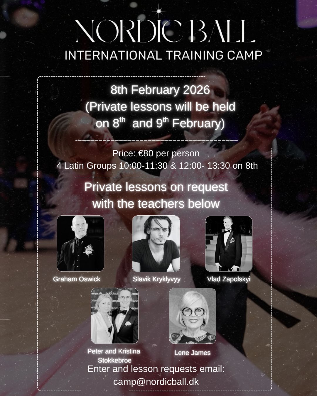 - 4 Latin groups with Slavik Kryklyvyy, Graham Oswick, Lene James and Peter & Kristina Stokkebroe on 8. Feb from 10:00 – 13:30